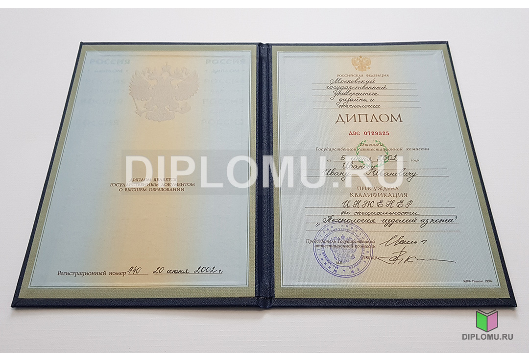На нашем сайте Вы можете купить диплом о высшем образовании с окончанием ВУЗа в 1997, 1998, 1999, 2000, 2001, 2002, 2003 годах. В данном разделе представлены образцы и фото диплома, ознакомиться подробнее с которыми можно, кликнув по картинкам ниже. Наши специалисты заполнят диплом по всем правилам, установленным Министерством образования и науки РФ. Заверяются «мокрыми» печатями и нужными подписями.
